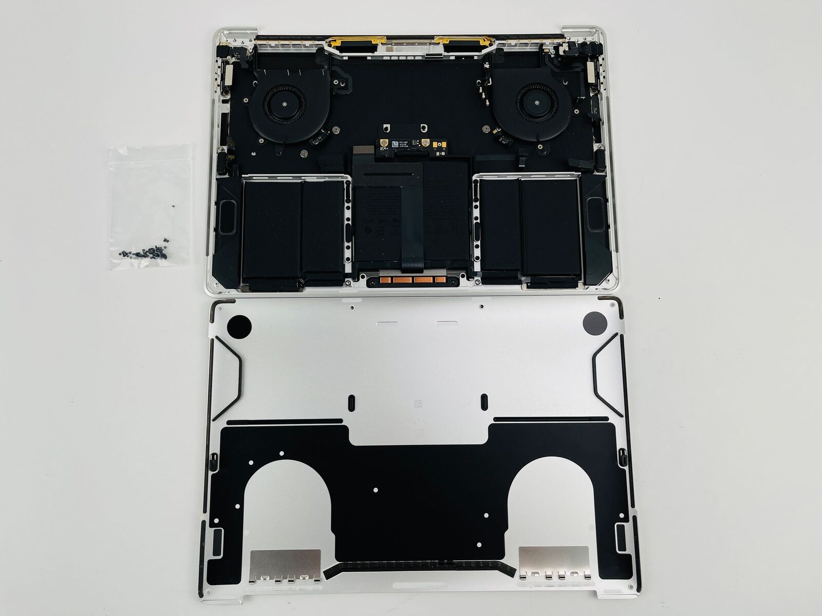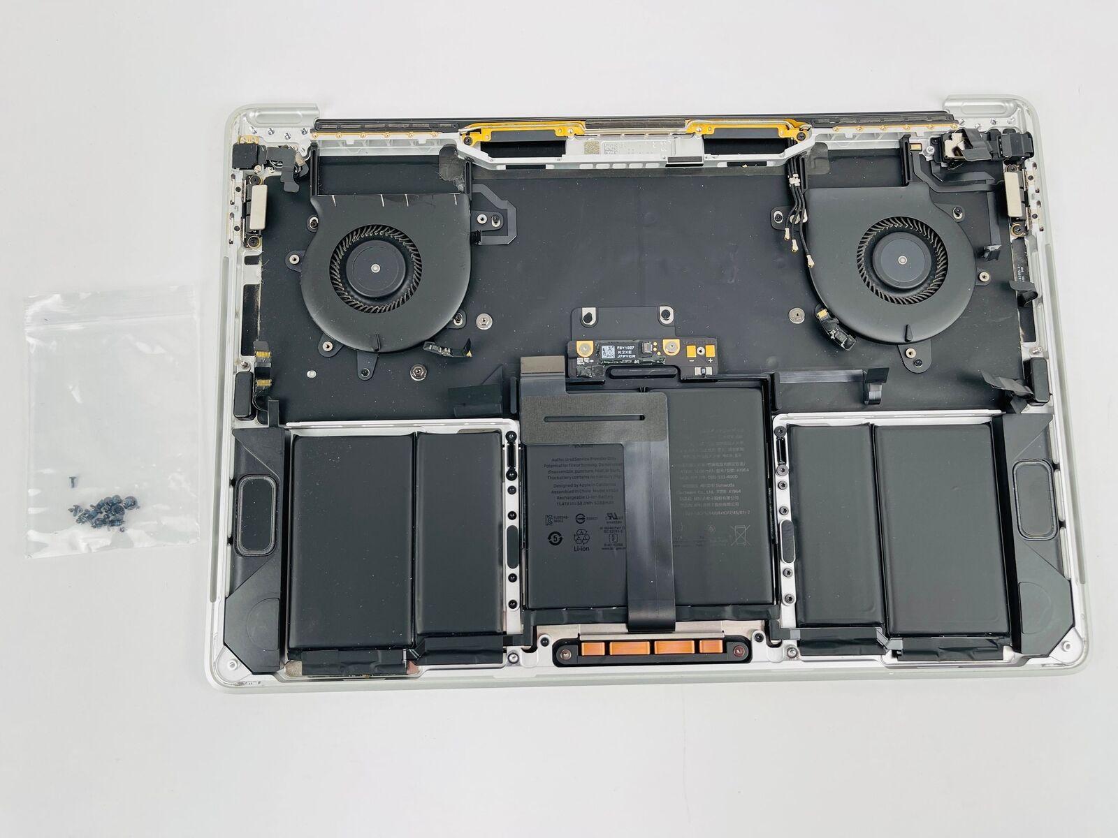 Sowie auf den Stockfotos abgebildet, wird das Topcase komplett inkl. Touch Bar, Akku, Trackpad, Tastatur, Lautsprecher und sonstigen Anbauteilen geliefert.